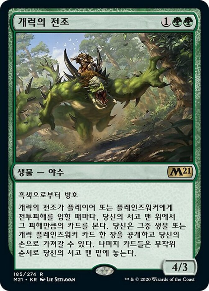 | Rules | Hexproof from black Whenever Garruk's Harbinger deals combat damage to a player or planeswalker, look at that many cards from the top of your library. You may reveal a creature card or Garruk planeswalker card from among them and put it into your hand. Put the rest on the bottom of your library in a random order. |