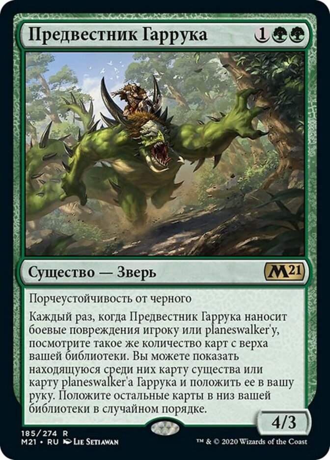 | Rules | Hexproof from black Whenever Garruk's Harbinger deals combat damage to a player or planeswalker, look at that many cards from the top of your library. You may reveal a creature card or Garruk planeswalker card from among them and put it into your hand. Put the rest on the bottom of your library in a random order. |