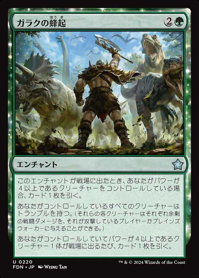 | Rules | When Garruk's Uprising enters the battlefield, if you control a creature with power 4 or greater, draw a card. Creatures you control have trample. (They can deal excess combat damage to the player or planeswalker they're attacking.) Whenever a creature with power 4 or greater enters the battlefield under your control, draw a card. |