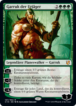| Rules | +1: Create a 3/3 green Beast creature token. −3: Draw cards equal to the greatest power among creatures you control. −6: Create a 6/6 green Wurm creature token for each land you control. |