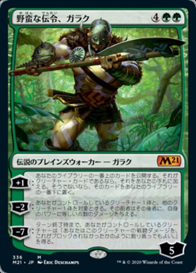 | Rules | +1: Reveal the top card of your library. If it's a creature card, put it into your hand. Otherwise, put it on the bottom of your library. −2: Target creature you control deals damage equal to its power to another target creature. −7: Until end of turn, creatures you control gain "You may have this creature assign its combat damage as though it weren't blocked." |