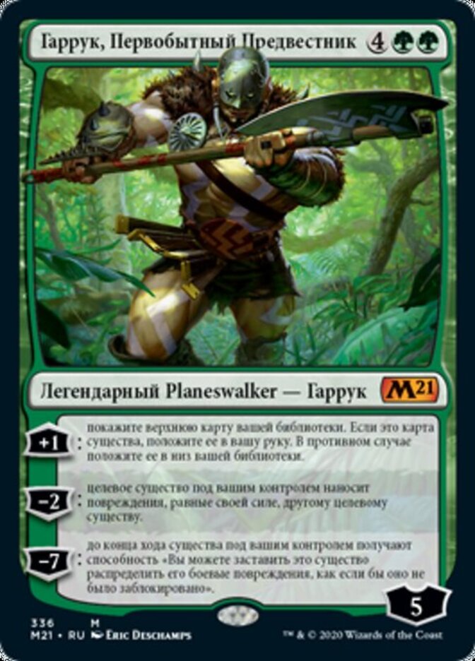 | Rules | +1: Reveal the top card of your library. If it's a creature card, put it into your hand. Otherwise, put it on the bottom of your library. −2: Target creature you control deals damage equal to its power to another target creature. −7: Until end of turn, creatures you control gain "You may have this creature assign its combat damage as though it weren't blocked." |