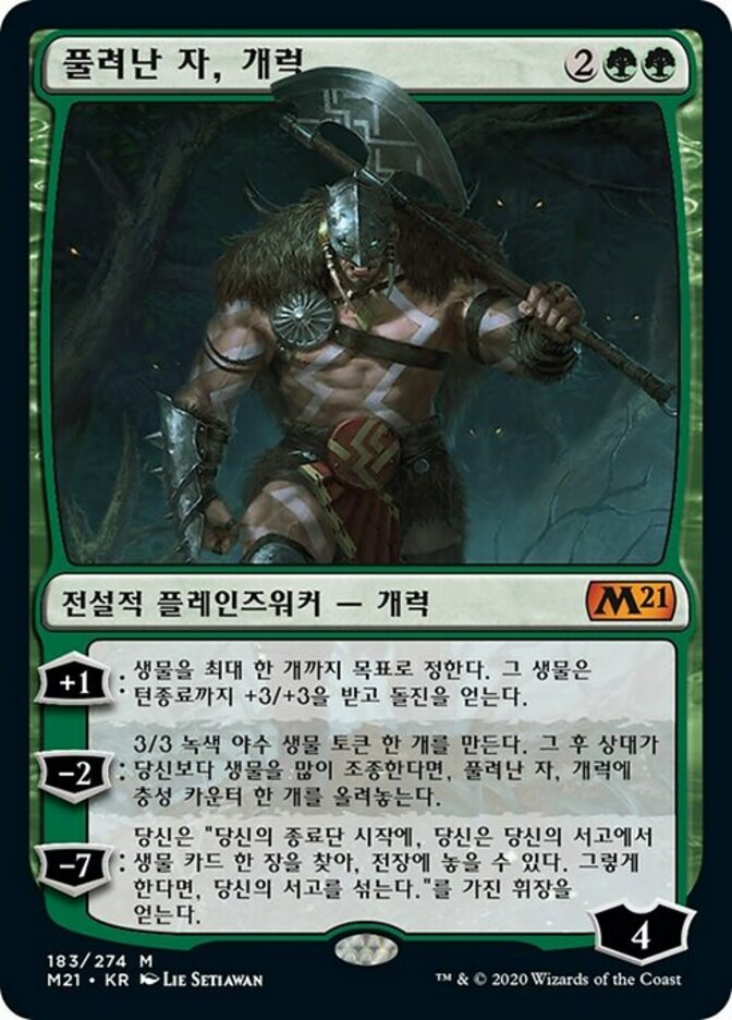 | Rules | +1: Up to one target creature gets +3/+3 and gains trample until end of turn. −2: Create a 3/3 green Beast creature token. Then if an opponent controls more creatures than you, put a loyalty counter on Garruk, Unleashed. −7: You get an emblem with "At the beginning of your end step, you may search your library for a creature card, put it onto the battlefield, then shuffle." |