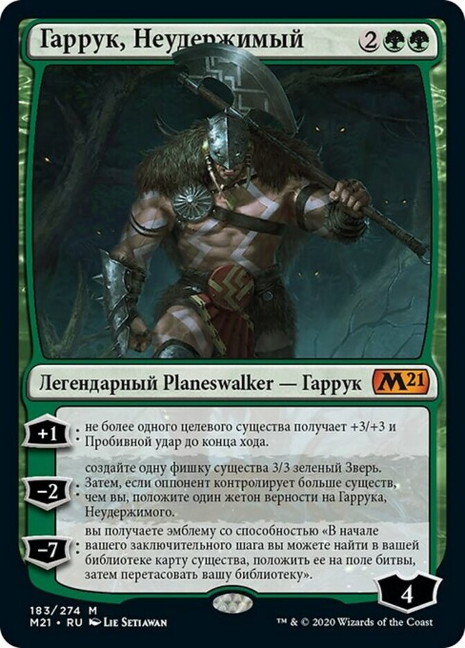 | Rules | +1: Up to one target creature gets +3/+3 and gains trample until end of turn. −2: Create a 3/3 green Beast creature token. Then if an opponent controls more creatures than you, put a loyalty counter on Garruk, Unleashed. −7: You get an emblem with "At the beginning of your end step, you may search your library for a creature card, put it onto the battlefield, then shuffle." |