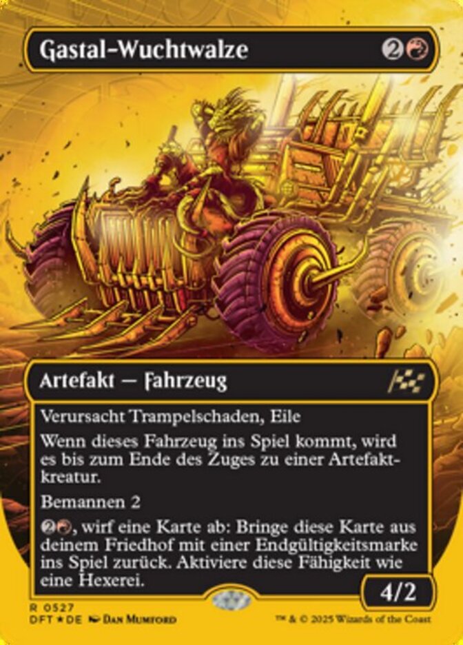 | Rules | Trample, haste When this Vehicle enters, it becomes an artifact creature until end of turn. Crew 2 , Discard a card: Return this card from your graveyard to the battlefield with a finality counter on it. Activate only as a sorcery. |
