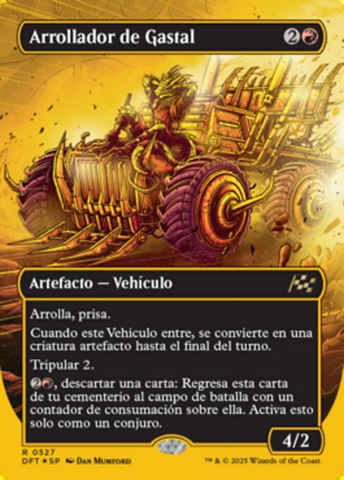 | Rules | Trample, haste When this Vehicle enters, it becomes an artifact creature until end of turn. Crew 2 , Discard a card: Return this card from your graveyard to the battlefield with a finality counter on it. Activate only as a sorcery. |