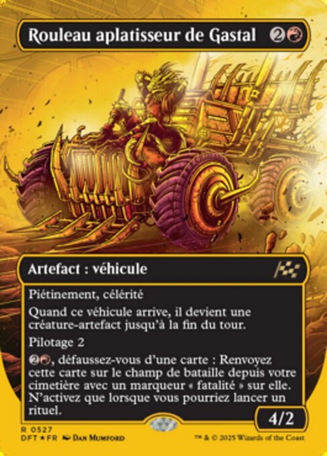 | Rules | Trample, haste When this Vehicle enters, it becomes an artifact creature until end of turn. Crew 2 , Discard a card: Return this card from your graveyard to the battlefield with a finality counter on it. Activate only as a sorcery. |