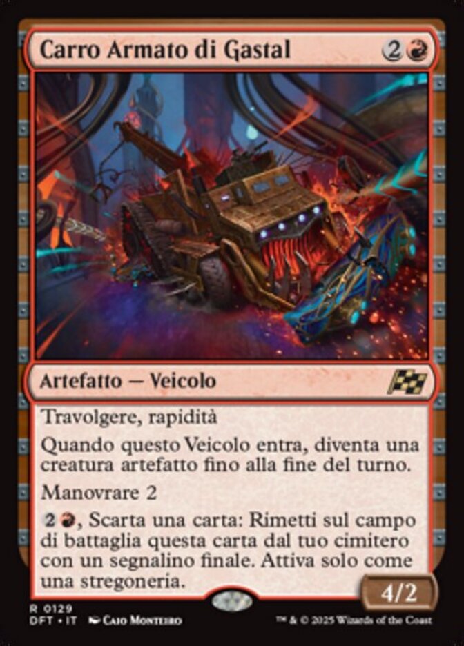 | Rules | Trample, haste When this Vehicle enters, it becomes an artifact creature until end of turn. Crew 2 , Discard a card: Return this card from your graveyard to the battlefield with a finality counter on it. Activate only as a sorcery. |