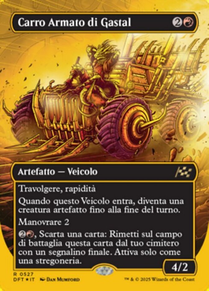 | Rules | Trample, haste When this Vehicle enters, it becomes an artifact creature until end of turn. Crew 2 , Discard a card: Return this card from your graveyard to the battlefield with a finality counter on it. Activate only as a sorcery. |