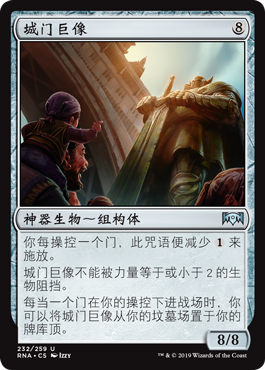 | Rules | This spell costs less to cast for each Gate you control. Gate Colossus can't be blocked by creatures with power 2 or less. Whenever a Gate enters the battlefield under your control, you may put Gate Colossus from your graveyard on top of your library. |