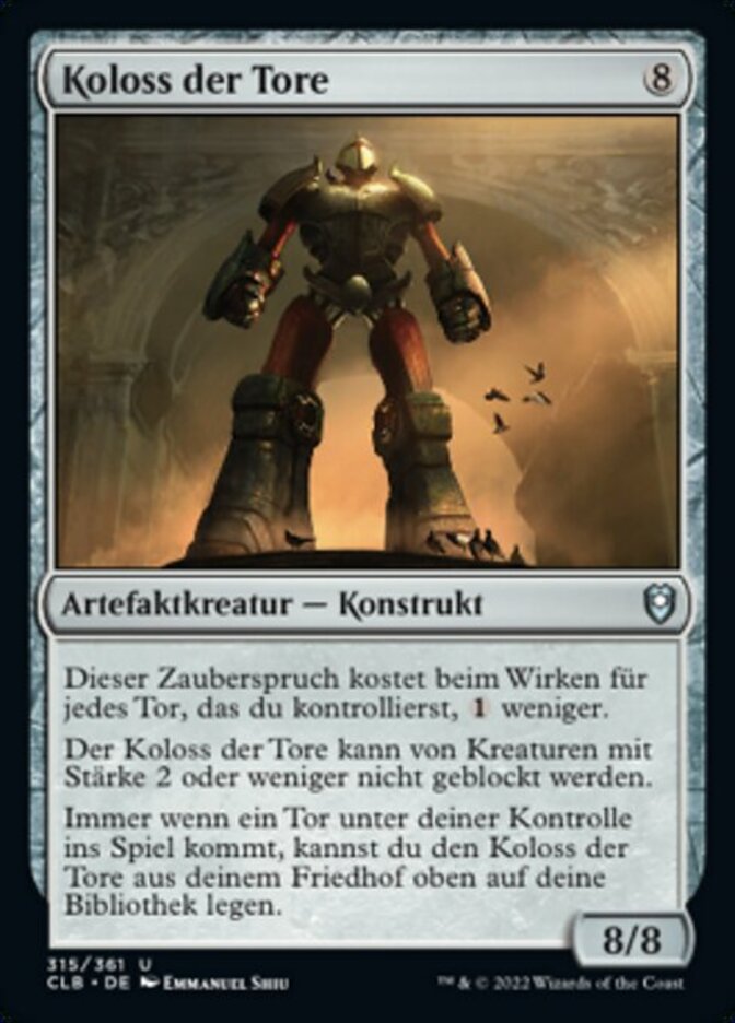 | Rules | This spell costs less to cast for each Gate you control. Gate Colossus can't be blocked by creatures with power 2 or less. Whenever a Gate enters the battlefield under your control, you may put Gate Colossus from your graveyard on top of your library. |
