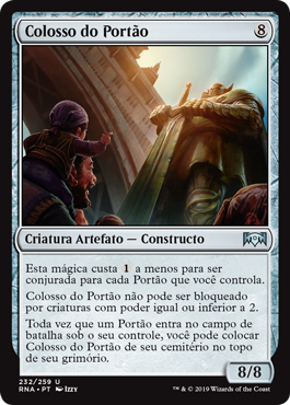 | Rules | This spell costs less to cast for each Gate you control. Gate Colossus can't be blocked by creatures with power 2 or less. Whenever a Gate enters the battlefield under your control, you may put Gate Colossus from your graveyard on top of your library. |