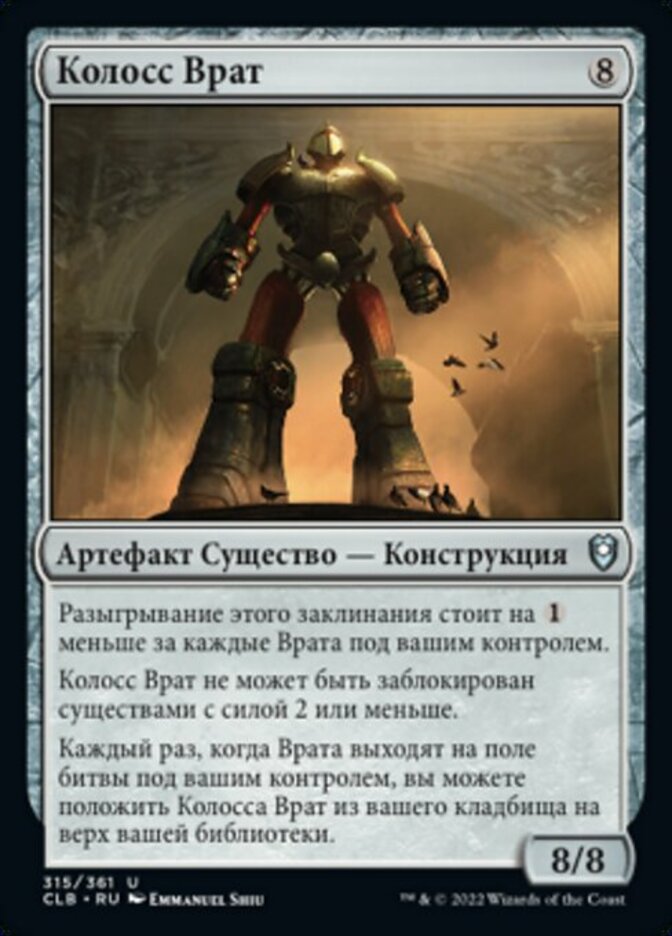 | Rules | This spell costs less to cast for each Gate you control. Gate Colossus can't be blocked by creatures with power 2 or less. Whenever a Gate enters the battlefield under your control, you may put Gate Colossus from your graveyard on top of your library. |