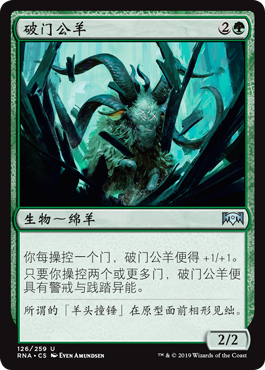 | Rules | Gatebreaker Ram gets +1/+1 for each Gate you control. As long as you control two or more Gates, Gatebreaker Ram has vigilance and trample. |