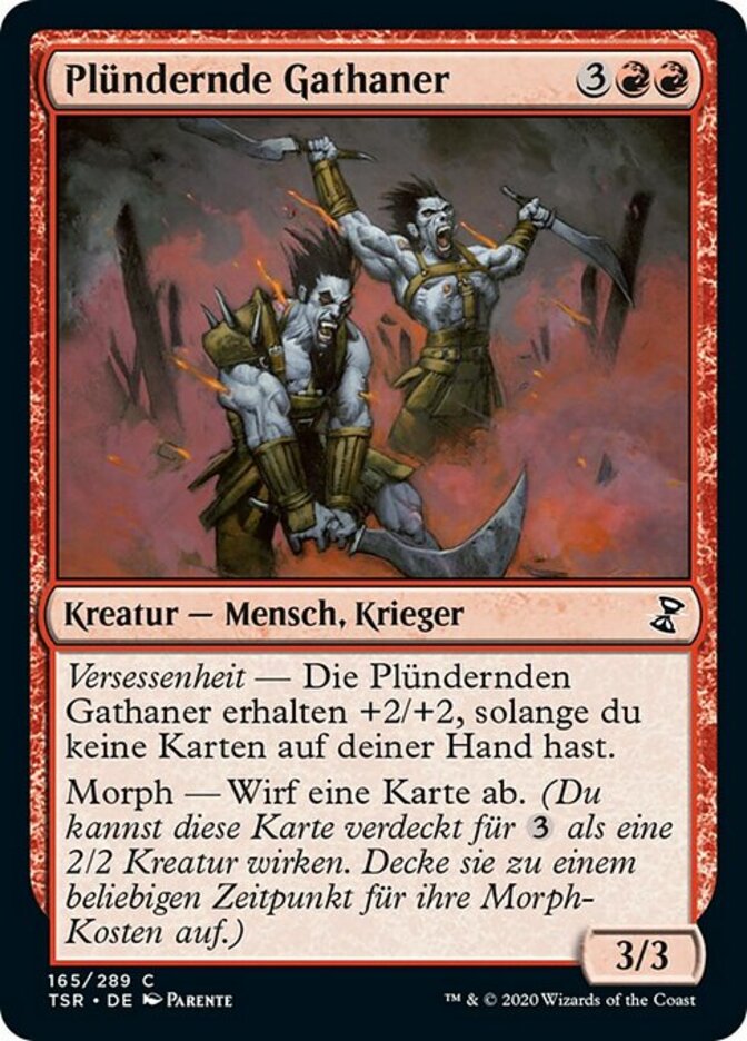 | Rules | Hellbent — Gathan Raiders gets +2/+2 as long as you have no cards in hand. Morph—Discard a card. (You may cast this card face down as a 2/2 creature for . Turn it face up any time for its morph cost.) |