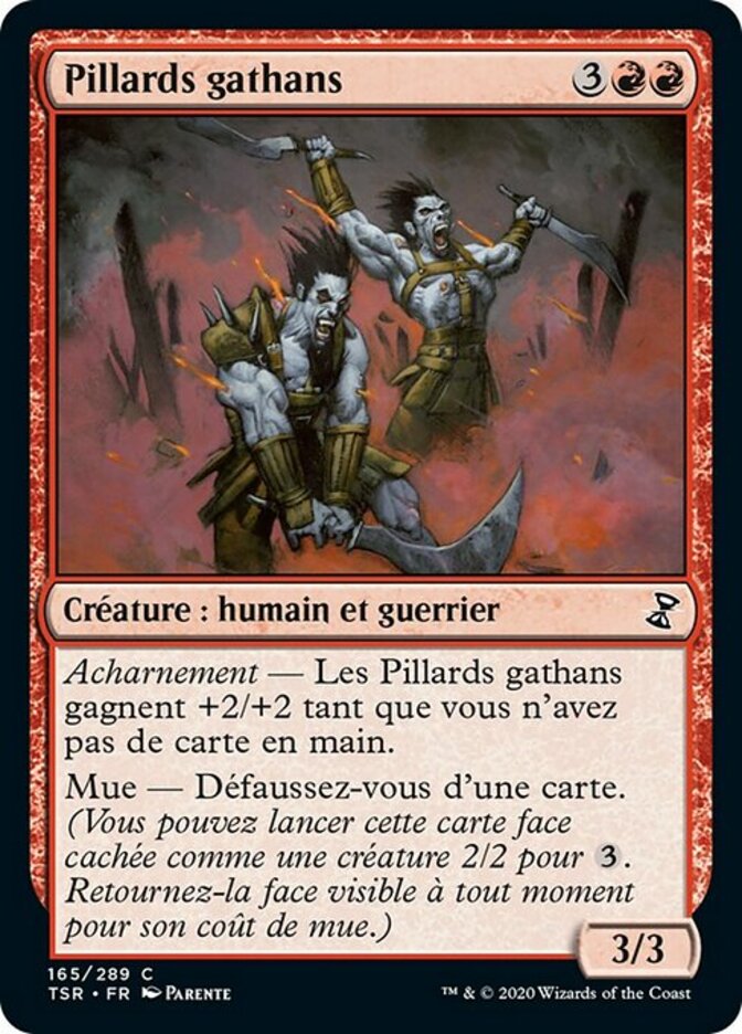| Rules | Hellbent — Gathan Raiders gets +2/+2 as long as you have no cards in hand. Morph—Discard a card. (You may cast this card face down as a 2/2 creature for . Turn it face up any time for its morph cost.) |