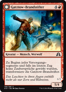 | Rules | At the beginning of each upkeep, if no spells were cast last turn, transform Gatstaf Arsonists. // Menace (This creature can't be blocked except by two or more creatures.) At the beginning of each upkeep, if a player cast two or more spells last turn, transform Gatstaf Ravagers. |