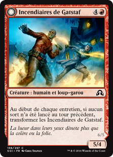 | Rules | At the beginning of each upkeep, if no spells were cast last turn, transform Gatstaf Arsonists. // Menace (This creature can't be blocked except by two or more creatures.) At the beginning of each upkeep, if a player cast two or more spells last turn, transform Gatstaf Ravagers. |