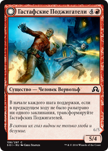 | Rules | At the beginning of each upkeep, if no spells were cast last turn, transform Gatstaf Arsonists. // Menace (This creature can't be blocked except by two or more creatures.) At the beginning of each upkeep, if a player cast two or more spells last turn, transform Gatstaf Ravagers. |
