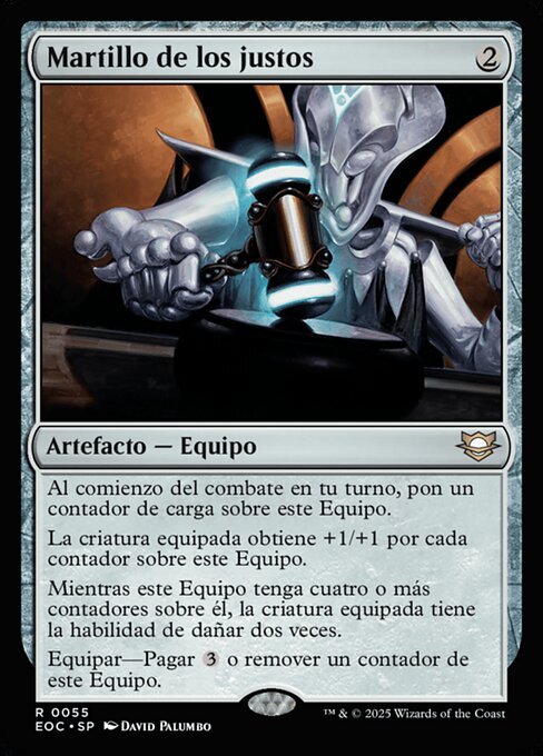 | Rules | At the beginning of combat on your turn, put a charge counter on Gavel of the Righteous. Equipped creature gets +1/+1 for each counter on Gavel of the Righteous. As long as Gavel of the Righteous has four or more counters on it, equipped creature has double strike. Equip—Pay or remove a counter from Gavel of the Righteous. |