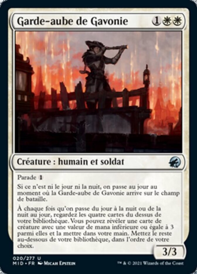 | Rules | Ward If it's neither day nor night, it becomes day as Gavony Dawnguard enters the battlefield. Whenever day becomes night or night becomes day, look at the top four cards of your library. You may reveal a creature card with mana value 3 or less from among them and put it into your hand. Put the rest on the bottom of your library in any order. |