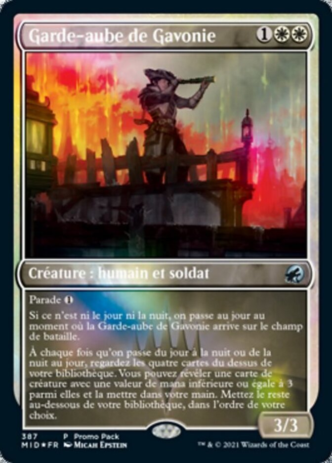 | Rules | Ward If it's neither day nor night, it becomes day as Gavony Dawnguard enters the battlefield. Whenever day becomes night or night becomes day, look at the top four cards of your library. You may reveal a creature card with mana value 3 or less from among them and put it into your hand. Put the rest on the bottom of your library in any order. |
