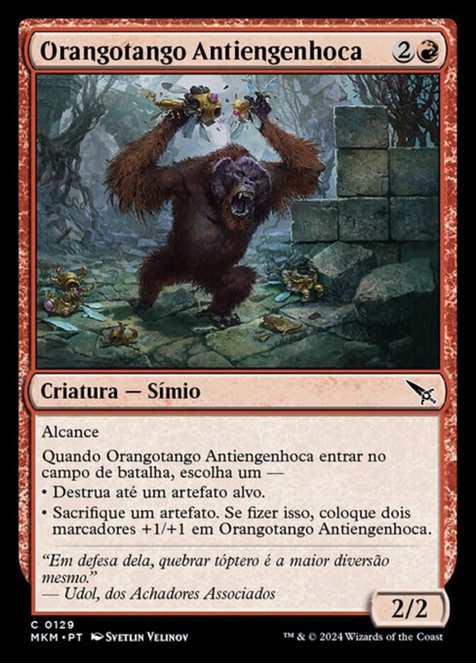 | Rules | Reach When Gearbane Orangutan enters the battlefield, choose one — • Destroy up to one target artifact. • Sacrifice an artifact. If you do, put two +1/+1 counters on Gearbane Orangutan. |