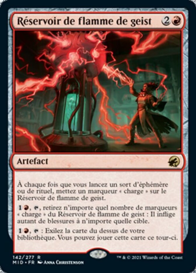 | Rules | Whenever you cast an instant or sorcery spell, put a charge counter on Geistflame Reservoir. , , Remove any number of charge counters from Geistflame Reservoir: It deals that much damage to any target. , : Exile the top card of your library. You may play that card this turn. |