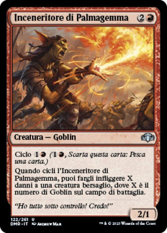 | Rules | Cycling (, Discard this card: Draw a card.) When you cycle Gempalm Incinerator, you may have it deal X damage to target creature, where X is the number of Goblins on the battlefield. |