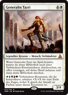 | Rules | When General Tazri enters the battlefield, you may search your library for an Ally creature card, reveal it, put it into your hand, then shuffle. : Ally creatures you control get +X/+X until end of turn, where X is the number of colors among those creatures. |