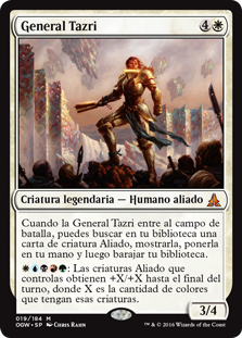 | Rules | When General Tazri enters the battlefield, you may search your library for an Ally creature card, reveal it, put it into your hand, then shuffle. : Ally creatures you control get +X/+X until end of turn, where X is the number of colors among those creatures. |