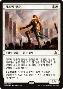 | Rules | When General Tazri enters the battlefield, you may search your library for an Ally creature card, reveal it, put it into your hand, then shuffle. : Ally creatures you control get +X/+X until end of turn, where X is the number of colors among those creatures. |