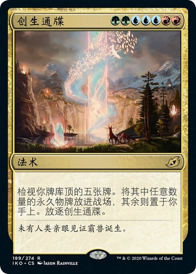 | Rules | Look at the top five cards of your library. Put any number of permanent cards from among them onto the battlefield and the rest into your hand. Exile Genesis Ultimatum. |