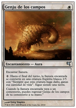 | Rules | Enchant Plains : Until end of turn, enchanted Plains becomes a 2/5 white Spirit creature with "Whenever this creature deals damage, its controller gains that much life." It's still a land. When enchanted Plains is put into a graveyard, you may return Genju of the Fields from your graveyard to your hand. |