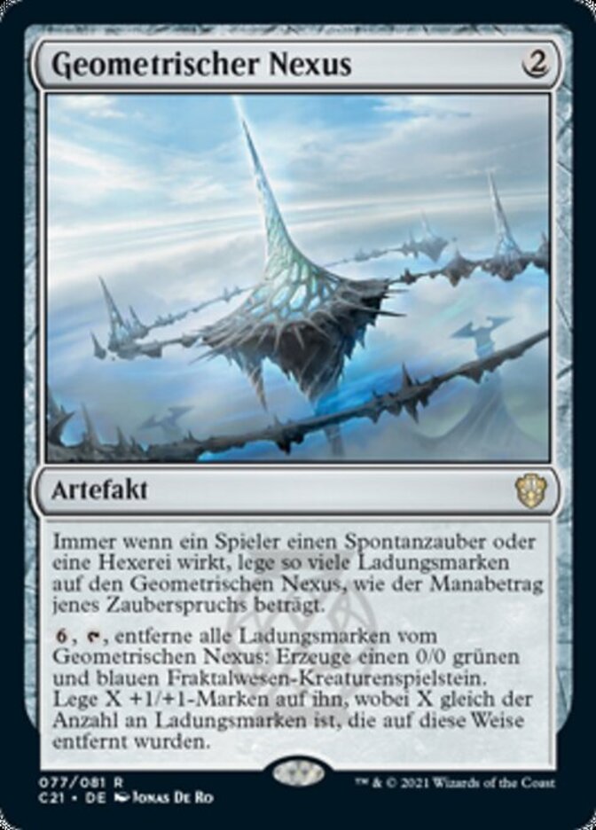 | Rules | Whenever a player casts an instant or sorcery spell, put a number of charge counters on Geometric Nexus equal to that spell's mana value. , , Remove all charge counters from Geometric Nexus: Create a 0/0 green and blue Fractal creature token. Put X +1/+1 counters on it, where X is the number of charge counters removed this way. |