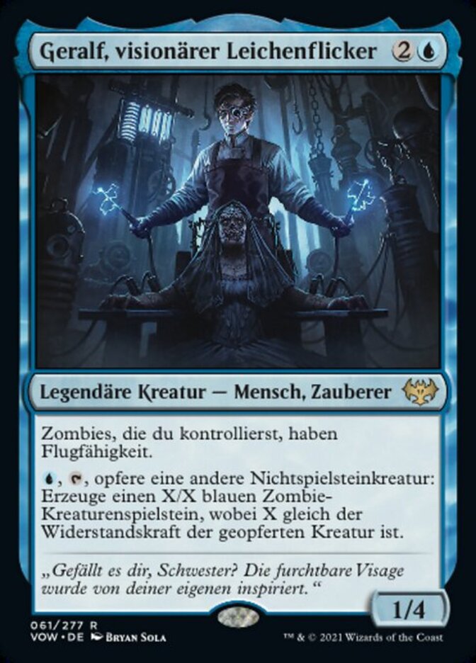 | Rules | Zombies you control have flying. , , Sacrifice another nontoken creature: Create an X/X blue Zombie creature token, where X is the sacrificed creature's toughness. |