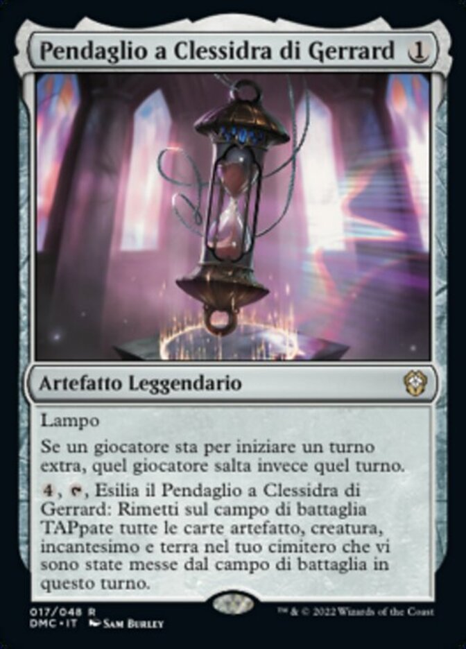 | Rules | Flash If a player would begin an extra turn, that player skips that turn instead. , , Exile Gerrard's Hourglass Pendant: Return to the battlefield tapped all artifact, creature, enchantment, and land cards in your graveyard that were put there from the battlefield this turn. |