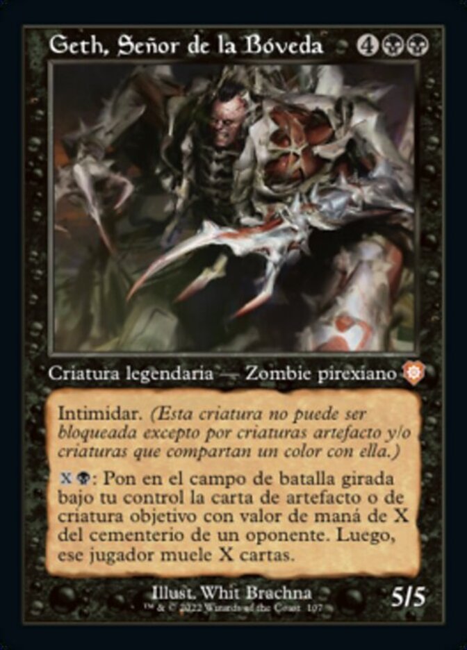 | Rules | Intimidate (This creature can't be blocked except by artifact creatures and/or creatures that share a color with it.) : Put target artifact or creature card with mana value X from an opponent's graveyard onto the battlefield under your control tapped. Then that player mills X cards. |