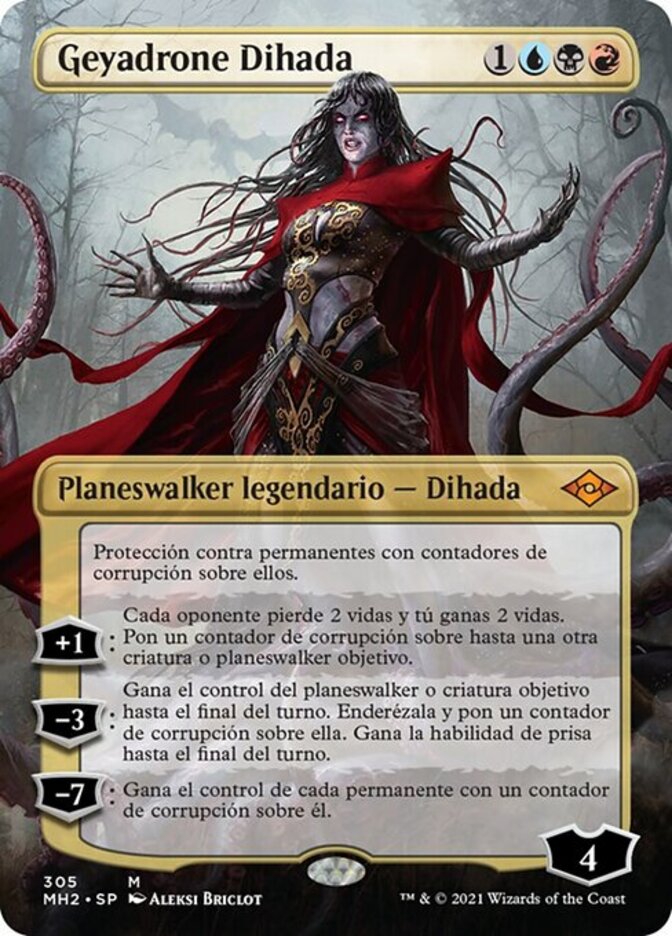 | Rules | Protection from permanents with corruption counters on them +1: Each opponent loses 2 life and you gain 2 life. Put a corruption counter on up to one other target creature or planeswalker. −3: Gain control of target creature or planeswalker until end of turn. Untap it and put a corruption counter on it. It gains haste until end of turn. −7: Gain control of each permanent with a corruption counter on it. |