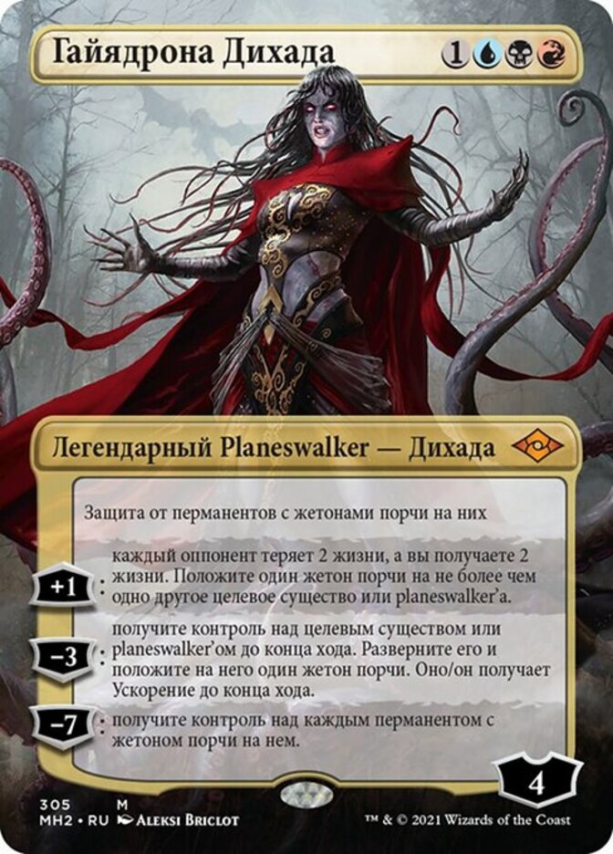| Rules | Protection from permanents with corruption counters on them +1: Each opponent loses 2 life and you gain 2 life. Put a corruption counter on up to one other target creature or planeswalker. −3: Gain control of target creature or planeswalker until end of turn. Untap it and put a corruption counter on it. It gains haste until end of turn. −7: Gain control of each permanent with a corruption counter on it. |