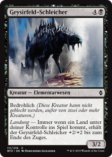 | Rules | Menace (This creature can't be blocked except by two or more creatures.) Landfall — Whenever a land enters the battlefield under your control, Geyserfield Stalker gets +2/+2 until end of turn. |