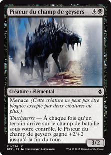 Landfall — Whenever a land enters the battlefield under your control, Geyserfield Stalker gets +2/+2 until end of turn.