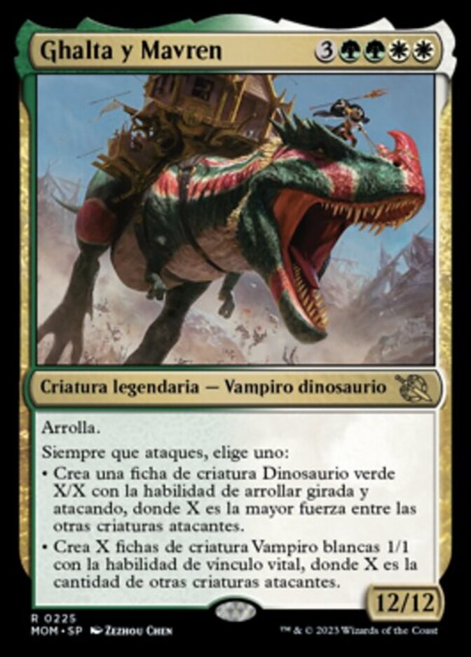 | Rules | Trample Whenever you attack, choose one — • Create a tapped and attacking X/X green Dinosaur creature token with trample, where X is the greatest power among other attacking creatures. • Create X 1/1 white Vampire creature tokens with lifelink, where X is the number of other attacking creatures. |