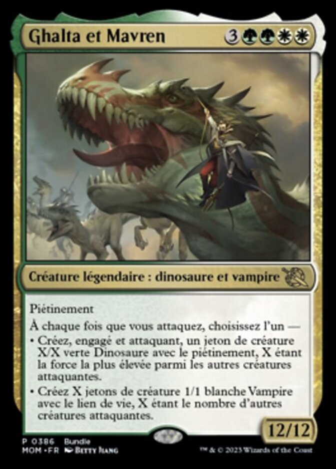 | Rules | Trample Whenever you attack, choose one — • Create a tapped and attacking X/X green Dinosaur creature token with trample, where X is the greatest power among other attacking creatures. • Create X 1/1 white Vampire creature tokens with lifelink, where X is the number of other attacking creatures. |