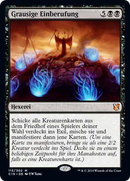 | Rules | Exile all creature cards from target player's graveyard in a face-down pile, shuffle that pile, then manifest those cards. (To manifest a card, put it onto the battlefield face down as a 2/2 creature. Turn it face up any time for its mana cost if it's a creature card.) |