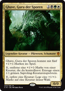 | Rules | Ghave, Guru of Spores enters the battlefield with five +1/+1 counters on it. , Remove a +1/+1 counter from a creature you control: Create a 1/1 green Saproling creature token. , Sacrifice a creature: Put a +1/+1 counter on target creature. |