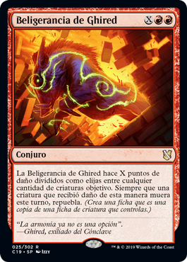 | Rules | Ghired's Belligerence deals X damage divided as you choose among any number of target creatures. Whenever a creature dealt damage this way dies this turn, populate. (Create a token that's a copy of a creature token you control.) |