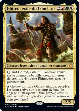 | Rules | When Ghired, Conclave Exile enters the battlefield, create a 4/4 green Rhino creature token with trample. Whenever Ghired attacks, populate. The token enters the battlefield tapped and attacking. (To populate, create a token that's a copy of a creature token you control.) |