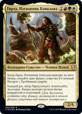 | Rules | When Ghired, Conclave Exile enters the battlefield, create a 4/4 green Rhino creature token with trample. Whenever Ghired attacks, populate. The token enters the battlefield tapped and attacking. (To populate, create a token that's a copy of a creature token you control.) |