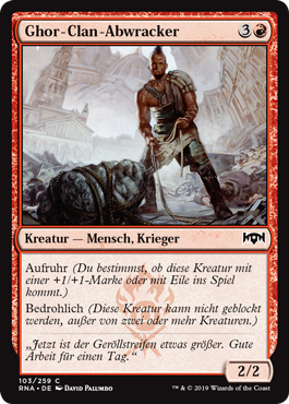 | Rules | Riot (This creature enters the battlefield with your choice of a +1/+1 counter or haste.) Menace (This creature can't be blocked except by two or more creatures.) |